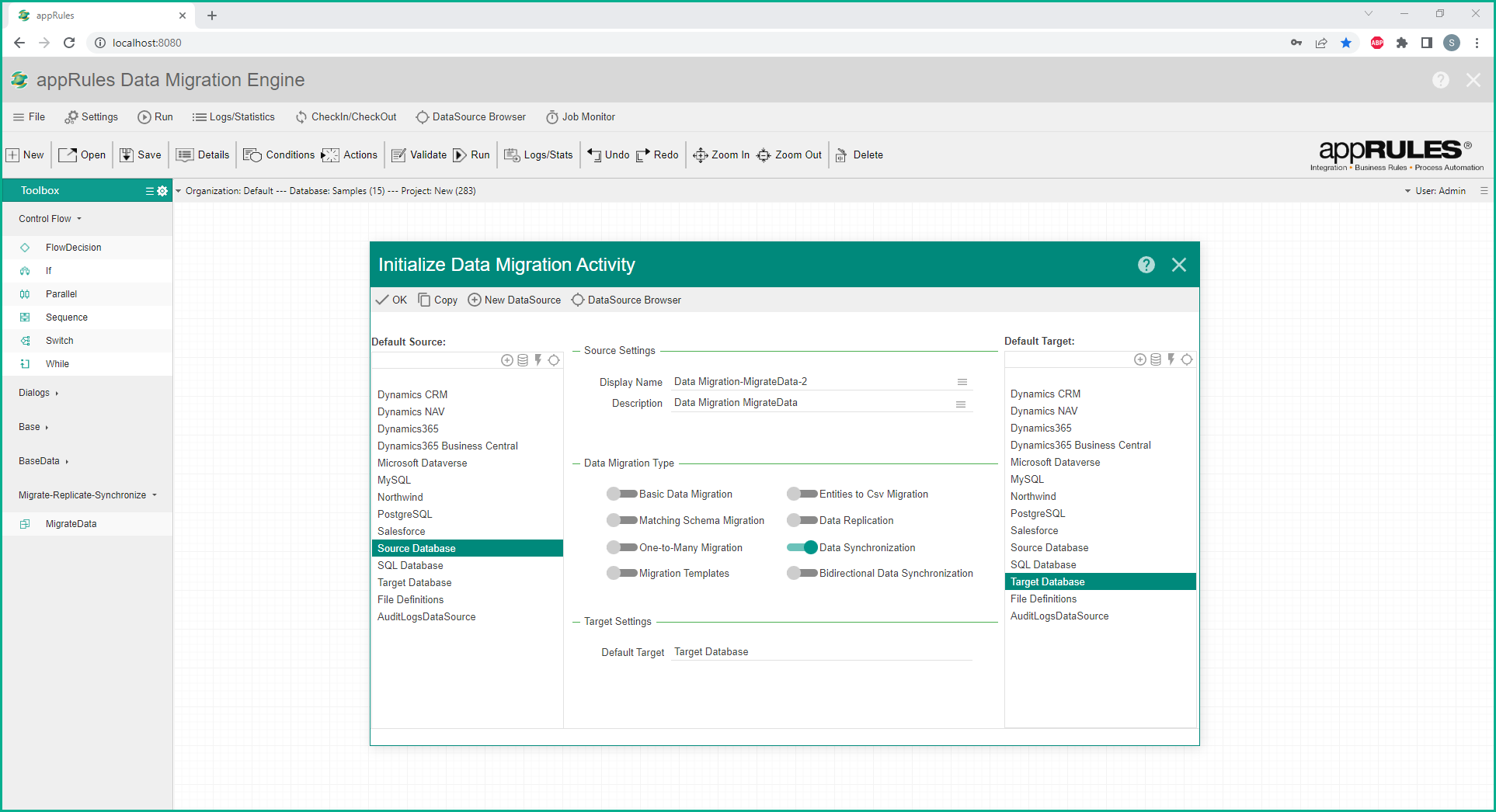 To perform "Data Synchronization"  using the appRules Data Migration Engine, drag-and-drop the MigrateData workflow activity from the toolbox on to the designer and configure as follows: