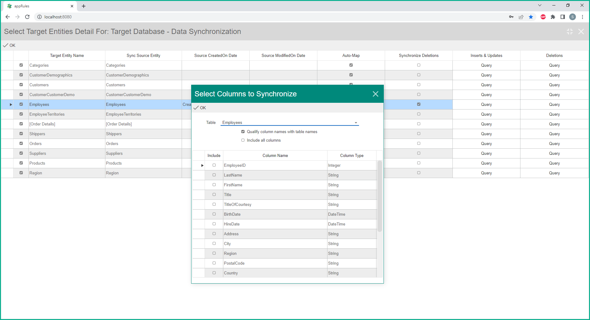 Once you complete the entries for data synchronization, click the OK button to display the Target Entities Collection: