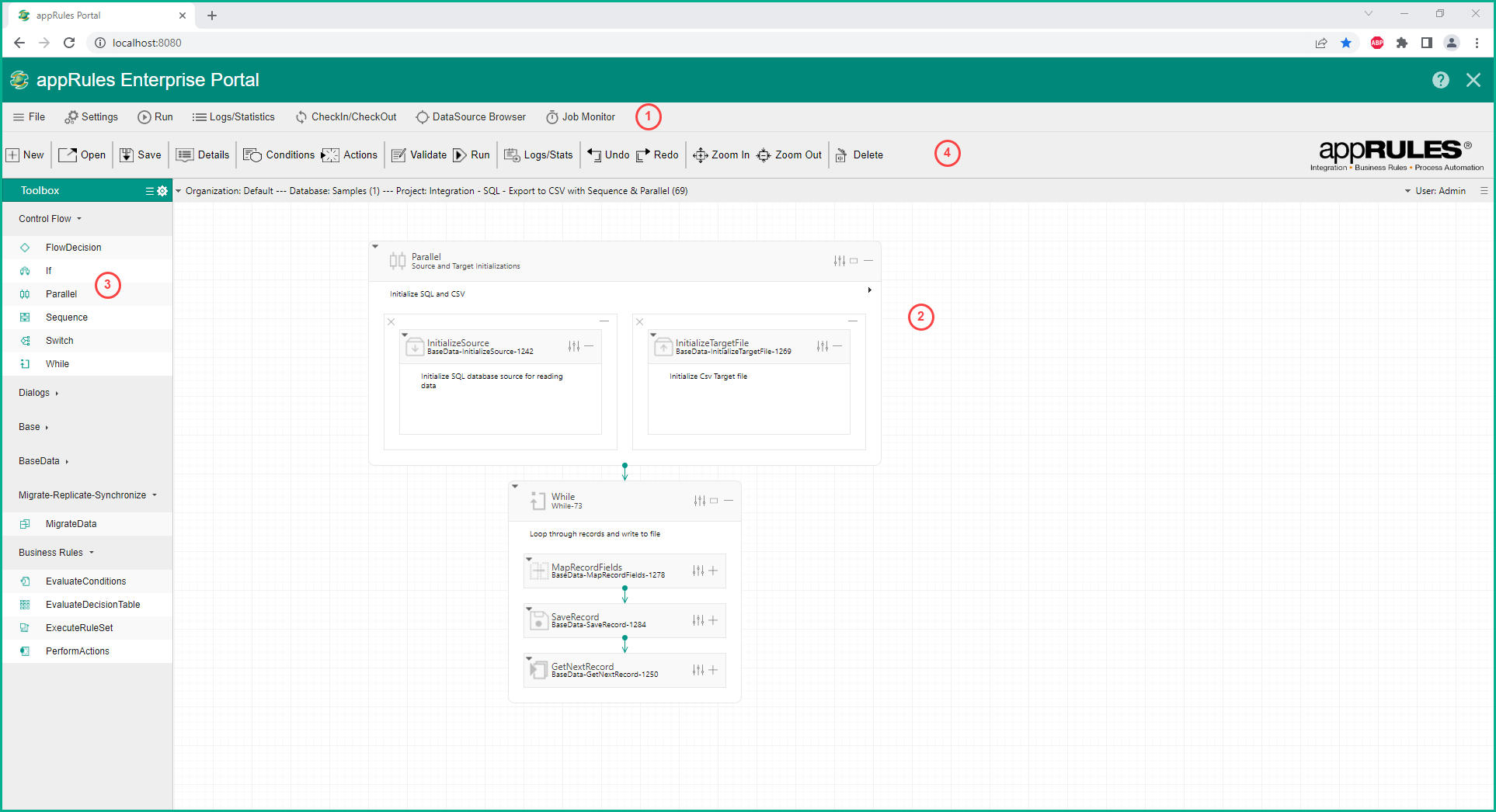 The Designer is the work surface for composing appRules projects. It is the drag/drop environment on which activities are defined and connected to form the flow of the process. To add a workflow activity to any part of the designer, drag it from the toolbox and drop it on the designer.