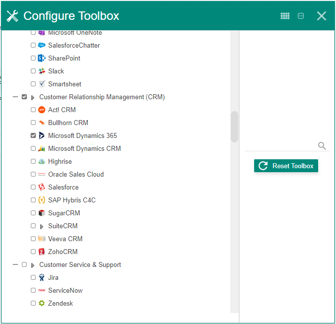 Select the modules to be included from each category (eg CRM, ERP, etc.) and Click ”Reset Toolbox” when done.