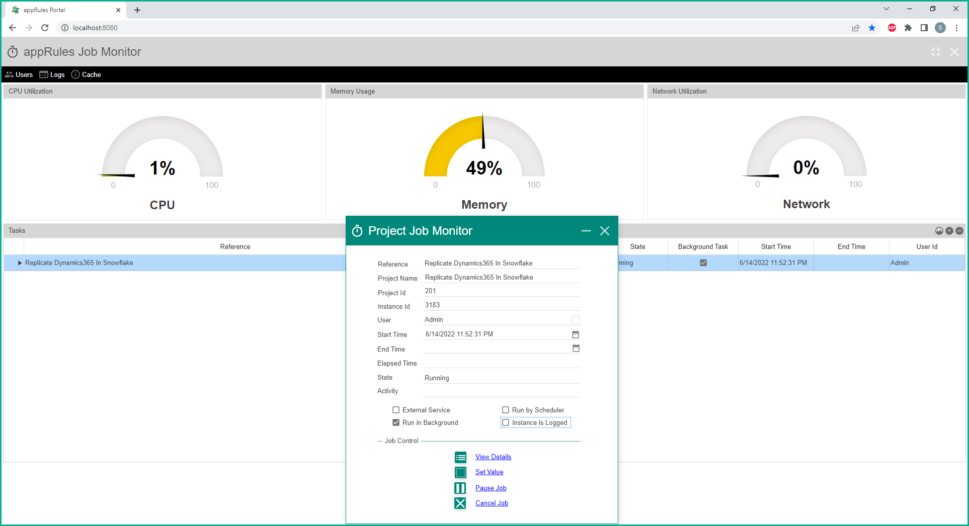 The appRules Job Monitor is used for monitoring running jobs.  Click the Job Monitor toolbar button on the home page to display the Job Monitor modal.