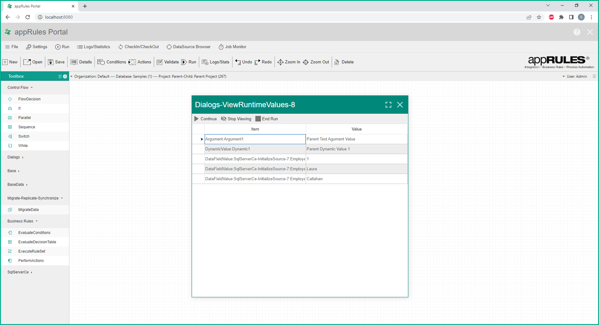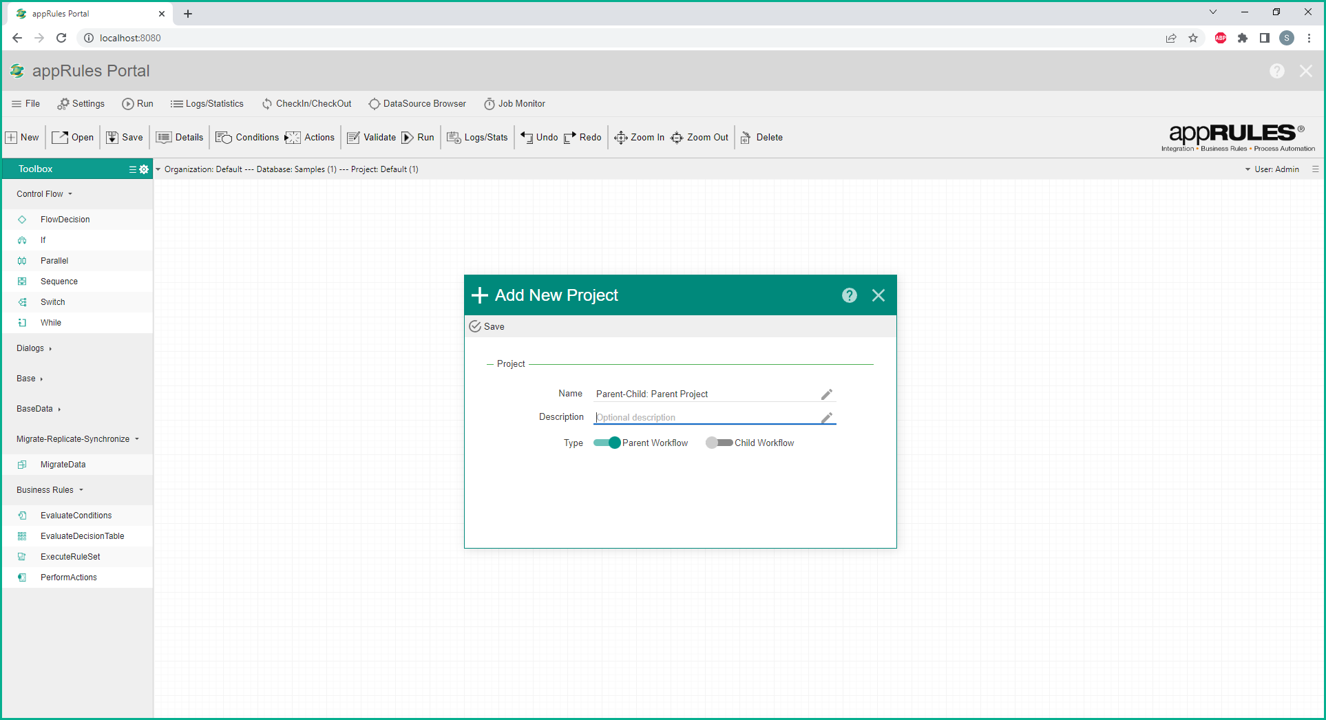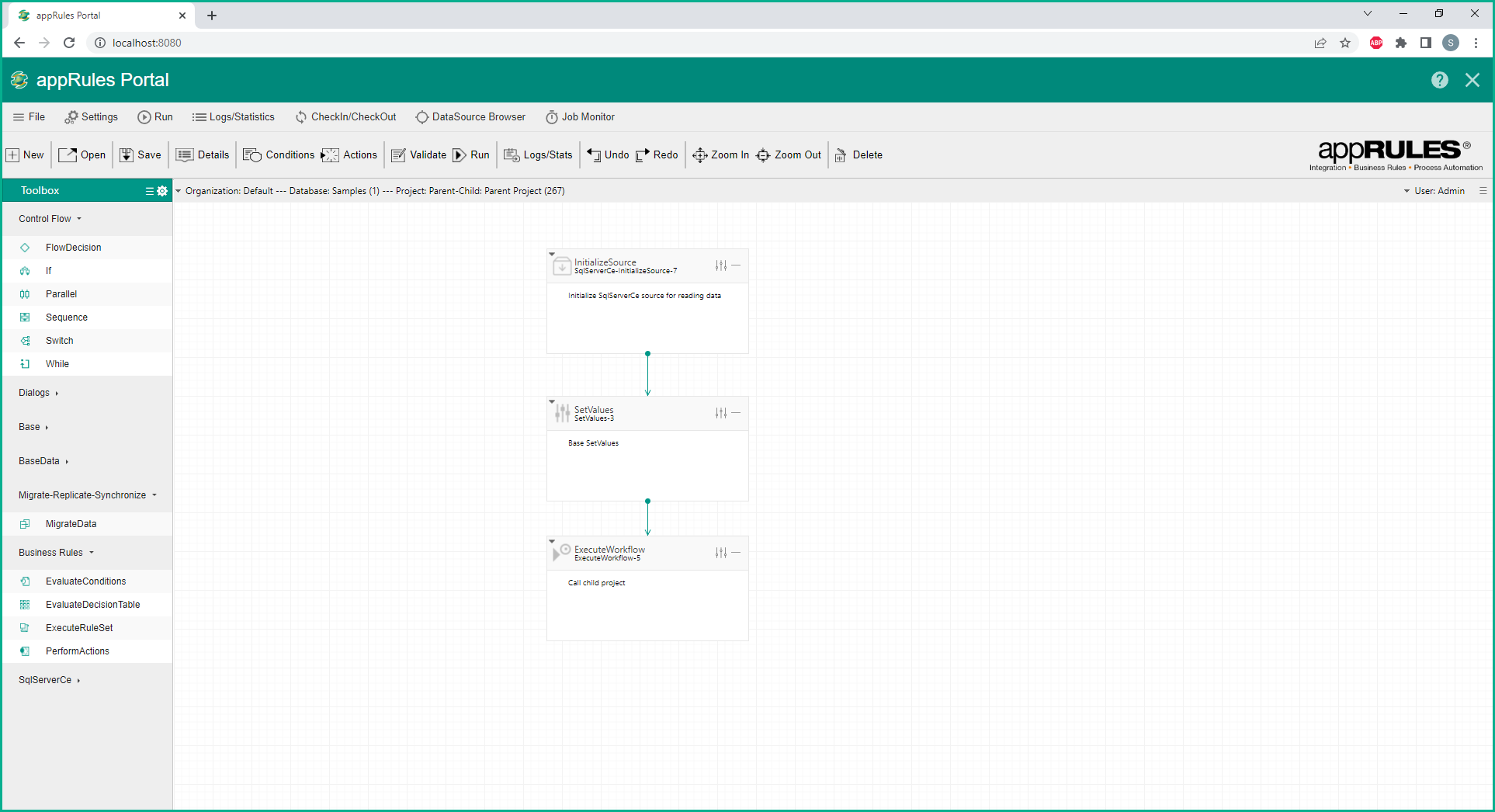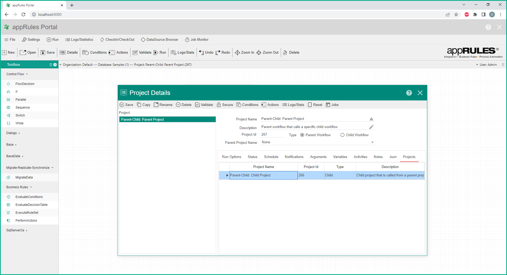 The Parent-Child: Parent Project sample project is used for demonstrating parent/child projects in appRules.   A parent project can has an unlimited number of child projects which can be called from the parent.  Child projects allow you to split very large projects into smaller projects to make them more manageable in the designer.
